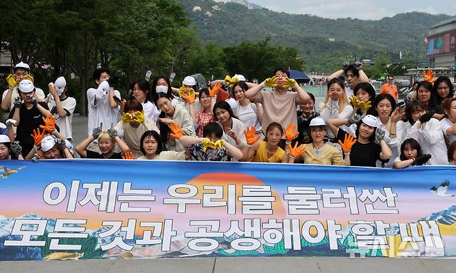 [서울=뉴시스] 배훈식 기자 = 국제 생물다양성의 날인 22일 오전 서울 종로구 광화문광장에서 녹색연합 주최로 무용수들이 자연의 권리 퍼포먼스 '공생 2'를 선보이고 있다. 2025.05.22. dahora83@newsis.com
