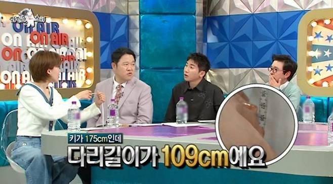 MC 장도연은 백지연의 키를 확인하기 위해 그의 다리 길이를 쟀고 “이게 되냐. 109cm다”라고 말해 스튜디오에 있는 모두를 놀라게 했다.
