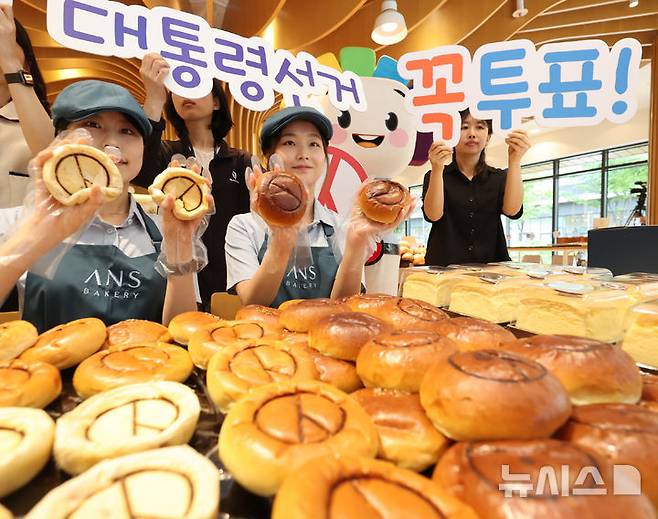 [인천=뉴시스] 전진환 기자 = 22일 오전 인천선거관리위원회와 안스베이커리가 제21대 대통령선거를 12일 앞두고 인천 미추홀구 안스베이커리에서 기표 모양이 담긴 빵을 출시하고 투표참여 캠페인을 벌이고 있다. 2025.05.22. amin2@newsis.com