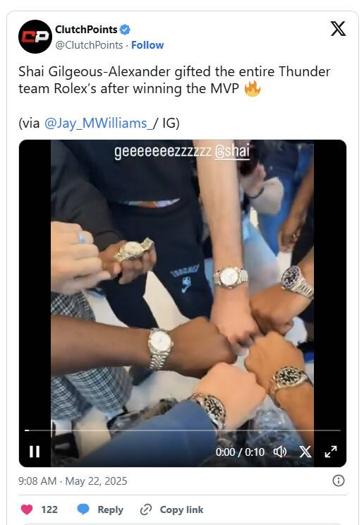‘클러치 포인트’는 “길저스 알렉산더는 조던만 달성했던 진기록과 함께 첫 MVP의 영예를 안았다. 무엇보다 큰 성과는 오클라호마시티를 승률 1위로 이끌었다는 점이었고, 그는 동료들에게 명품 시계를 선물하며 감사한 마음을 전했다. 단순히 화려한 성과를 과시하는 차원이 아니었다. 선물을 통해 진정한 마음과 리더십을 엿볼 수 있는 것은 물론, 오클라호마시티의 라커룸 분위기가 얼마나 좋은지도 알 수 있다”라고 보도했다.