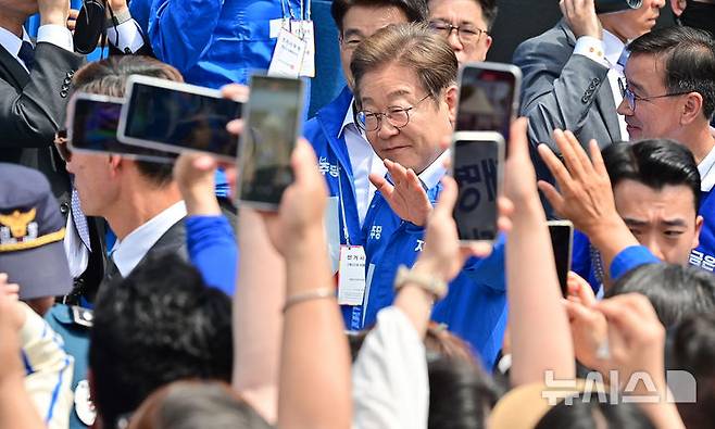 [제주=뉴시스] 우장호 기자 = 이재명 더불어민주당 대선 후보가 22일 오전 제주시 일도일동 동문로터리에서 열린 유세장에서 연단에 오르고 있다. 2025.05.22. woo1223@newsis.com