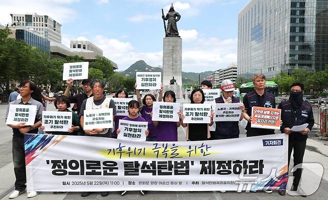 (서울=뉴스1) 임세영 기자 = 탈석탄법제정을위한시민사회연대 관계자들이 22일 서울 종로구 세종로 광화문광장에서 기후위기 극복을 위한 '정의로운 탈석탄법' 제정 촉구 기자회견을 하고 있다. 2025.5.22/뉴스1