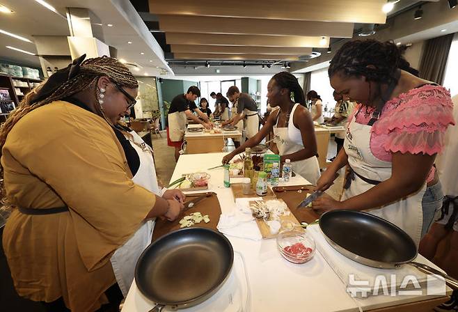[서울=뉴시스] 김명년 기자 = 미국 조지아대학교 학생들이 22일 오전 서울 중구 샘표 우리맛공간에서 열린 한식 쿠킹클래스에서 한식을 요리하고 있다. 2025.05.22. kmn@newsis.com