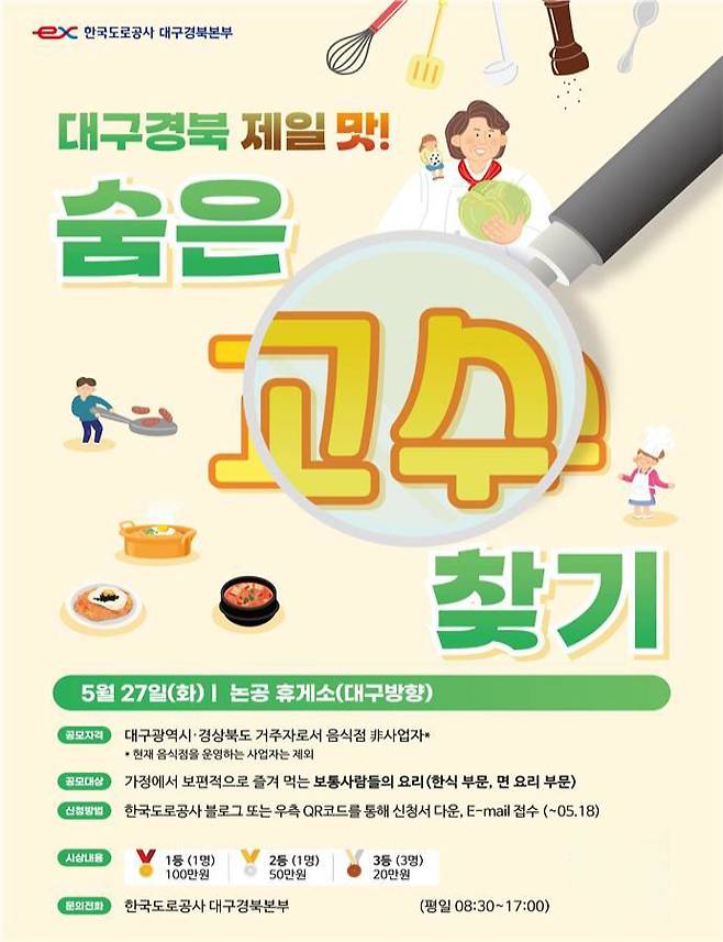한국도로공사 대구경북본부는 27일 대구광주고속도로 대구방향 논공휴게소에서 ‘대구경북제일맛 숨은 맛 고수 찾기’ 요리경연대회를 연다고 22일 밝혔다.
