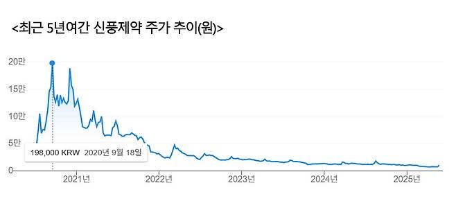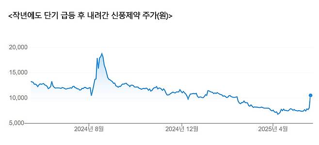 신풍제약도 그렇다. 작년 8월5일 1만460원에서 같은달 19일 1만8740원까지 올랐다가 같은달 말 1만3250원으로 다시 내렸다. 이후 주가는 꾸준히 더 빠져 지난 2월엔 주당 1만원선이 깨졌다. 지난달부터 이달 중순까진 주가가 주당 7000원대를 헤맸다.