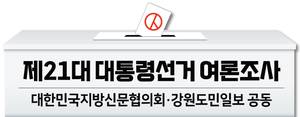 한편 강원도민일보 등 대한민국지방신문협의회는 여론조사 기관인 한국갤럽에 의뢰해 지난 20~21일 이틀간 만18세 이상 전국 유권자 1007명을 대상으로 대선 여론조사를 실시했다. 표본은 무선 RDD 표본 프레임에서 무작위로 추출해 전화조사원 인터뷰(CATI) 방식으로 조사했다. 표본오차는 95% 신뢰수준에 ±3.1%포인트, 응답률은 15.8%였다. 자세한 사항은 중앙선거여론조사심의위원회 홈페이지 참조하면 된다.