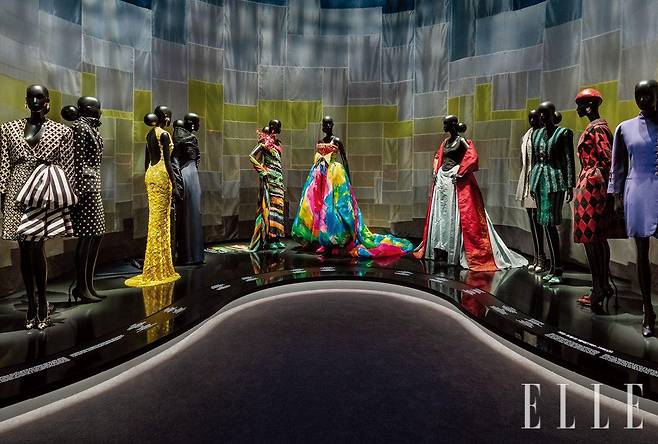 다음 공간은 1947년부터 현재까지 디올 아티스틱 디렉터들이 선보인 독창적인 아이디어를 전시한다. 한국 전통 패치워크 기법인 조각보에서 영감받은 공간에서 펼쳐지는 히스토리. 브랜드 창립자인 크리스챤 디올과 그의 뒤를 이은 아티스틱 디렉터들의 작품이 하나의 내러티브로 이어지며 전시의 마지막에는 아티스트 제이디 차가 완성한 크리스챤 디올의 초상화까지 만날 수 있다. 디올 아틀리에의 탁월한 노하우를 기념하는 공간 또한 압도적이었다. 화이트 캔버스와 거울로 완성한 이곳은 빛 반사 효과를 통해 재단사들의 장인 정신을 드라마틱하게 보여준다. 순백의 공간을 지나고 나면 컬러라마 전시 공간은 색채 조합을 활용한 몰입형 설치미술 작품을 선보이며 디올 액세서리의 중요성을 다시 한 번 강조했다.