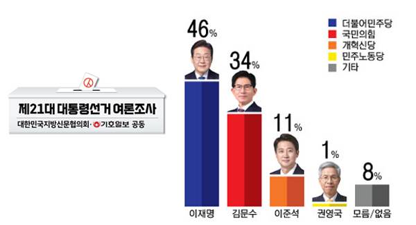 [대신협 ·기호일보] 이재명 46% ·김문수 34%· 이준석 11%