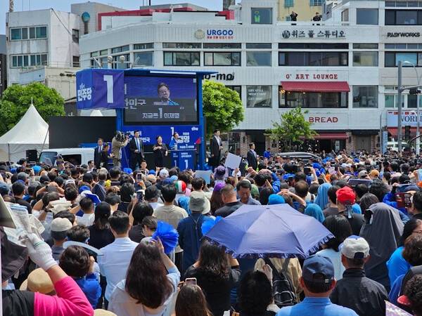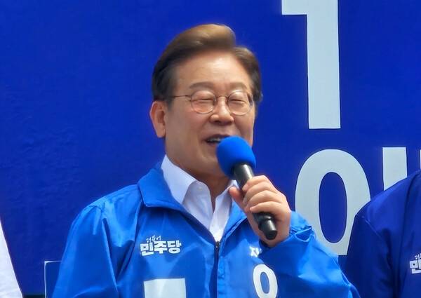 | ▲ 22일 제주시 동문시장 앞 탐라문화광장에서 거리 유세에 나선 더불어민주당 이재명 대선 후보. |