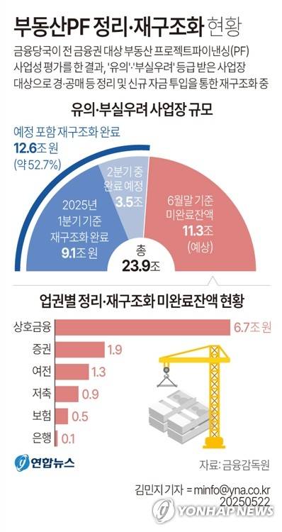 (서울=연합뉴스) 김민지 기자 = 22일 금융감독원에 따르면 23조9천억원 규모의 부실 부동산 프로젝트파이낸싱(PF) 중 52.7%인 12조6천억원 규모가 올해 상반기 내 정리·재구조화가 완료될 예정이다.