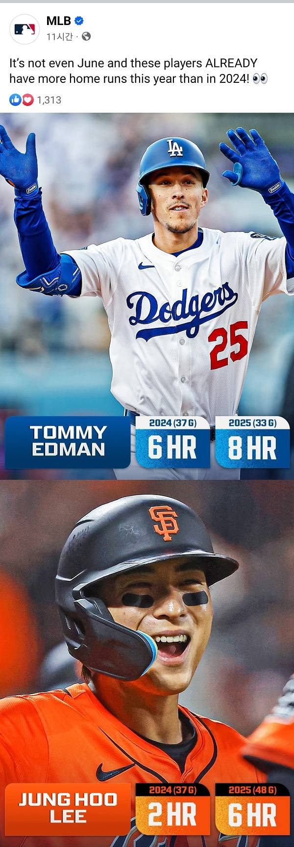 '작년보다 더 많은 홈런을 기록 중인 선수들' 명단에 국내 팬들에게 익숙한 두 이름이 나란히 소개됐다.