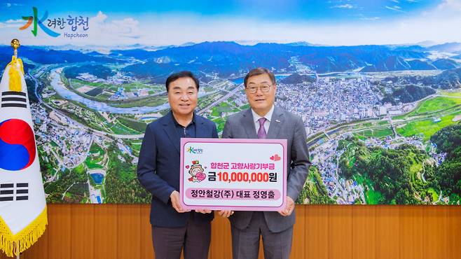 대구 정안철강(주) 정영출 대표와 석진철강(주) 정영식 대표가 합천군 고향사랑기부에 동참하며 각 1000만원씩 총 2000만 원의 기부금을 기탁했다.