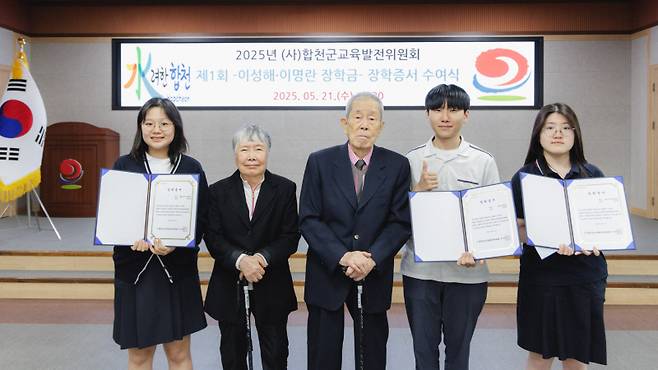 합천군교육발전위원회(이사장 김윤철)은 5월21일 합천군청 대회의실에서 ‘이성해‧이명란 장학금’ 장학증서 수여식을 개최하고 지역 고등학생 6명에게 장학증서를 전달했다.