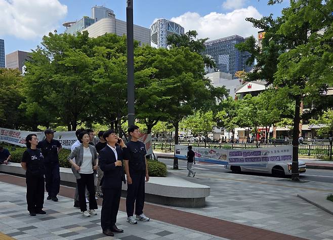 변광용 시장은 22일 서울 한화 본사 앞에 있는 거통고조선하청지회의 고공농성 현장을 찾았다. 김형수 지회장은 3월 15일 이곳 30m 높이의 폐쇄회로(CC-TV) 철탑에 올라가 이날까지 69일째 농성하고 있다.
