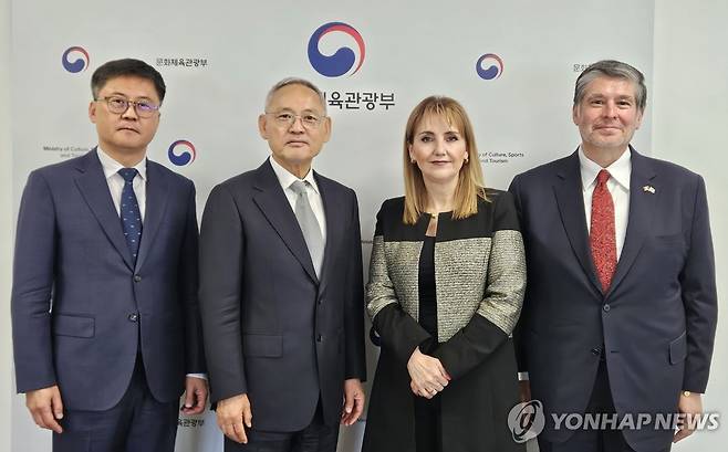 (서울=연합뉴스) 유인촌 문화체육관광부 장관이 22일 서울 종로구 국립현대미술관 서울관에서 세계관광기구 사무총장 선거에 출마한 글로리아 게바라 멕시코 전 관광장관(오른쪽 두 번째)과 기념 촬영하고 있다. 2025.5.22 [문화체육관광부 제공. 재판매 및 DB 금지]