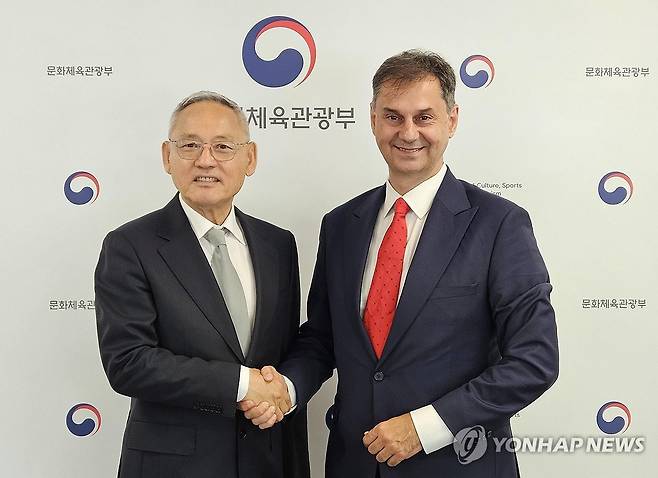 (서울=연합뉴스) 유인촌 문화체육관광부 장관이 22일 서울 종로구 국립현대미술관 서울관에서 세계관광기구 사무총장 선거에 출마한 해리 테오하리스 그리스 전 관광장관과 기념 촬영하고 있다. 2025.5.22 [문화체육관광부 제공. 재판매 및 DB 금지]