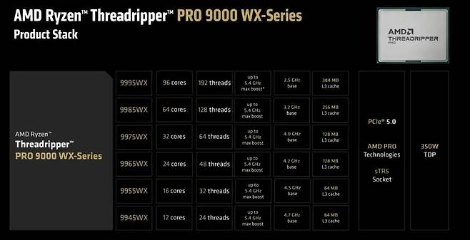 또한 프로와 HEDT 모델 모두 동일한 소켓과 350W TDP를 유지하면서 젠5(Zen 5) 기반으로 성능이 대폭 향상된 점이 특징이다. 각 모델별 세부 사양은 아래와 같다.
