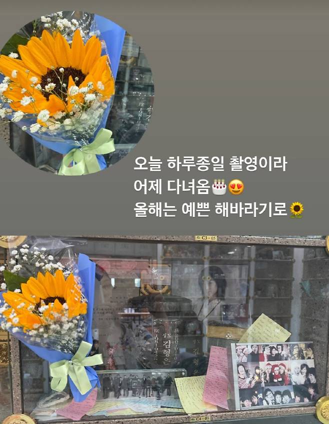 22일 심진화는 자신의 계정에 "김형은 생일 축하해. 오늘 하루종일 촬영이라 어제 다녀옴. 올해는 예쁜 해바라기로"라는 글과 함께 사진 두 장을 게재했다.