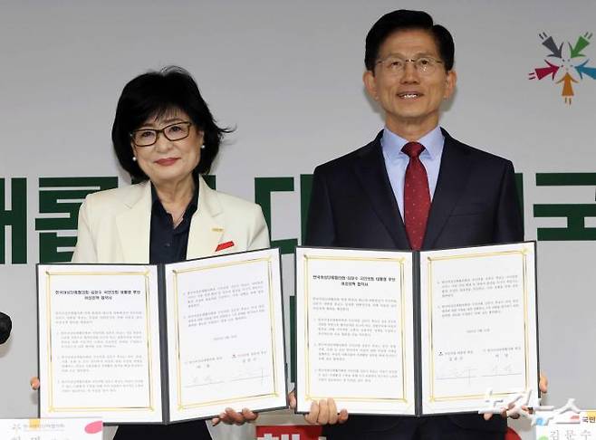 김문수 국민의힘 대선후보와 허명 한국여성단체회의회 회장이 22일 서울 용산구 한국여성단체협의회에서 열린 '한국여성단체협의회·국민의힘 정책협약식'에서 기념촬영을 하고 있다.