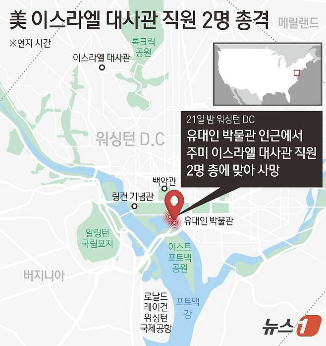 (서울=뉴스1) 김초희 디자이너 = 주미 이스라엘 대사관 직원 2명이 21일(현지시간) 워싱턴 DC에 있는 '수도 유대인 박물관' 인근에서 총에 맞아 사망했다고 로이터 및 AFP통신이 보도했다. 총격은 박물관 밖 인도에서 발생했으며 용의자는 직후 박물관에 들어가 있다가 체포됐다. 경찰은 용의자를 시카고 출신의 30세 엘리아스 로드리게스로 확인했다.