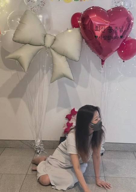 놀란 김희선은 바닥에 맨발로 무릎까지 꿇은 모습. 옷을 갈아입은 김희선은 선글라스를 끼고 직원들과 행복한 표정으로 생일 인증샷을 남겼다.