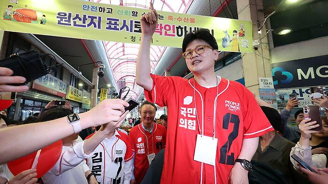 ▲ 한동훈 전 국민의힘 대표가 22일 청주 육거리시장을 찾아 김문수 대선 후보의 지원 유세를 하고 있다.