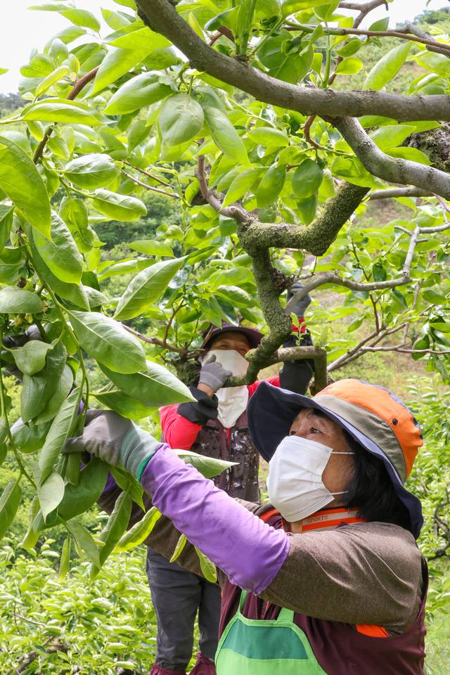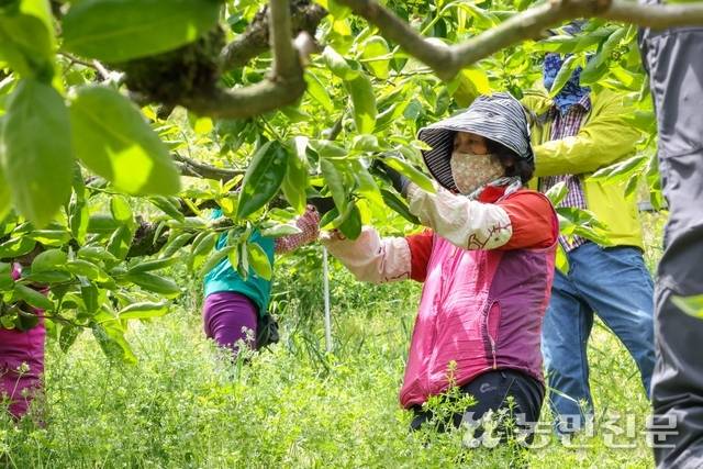 19일 경남 창녕군 이방면 석리 가현농원(대표 방철기·66)에서 NH농협 창녕군지부 농촌인력중개센터(센터장 김정식)를 통해 동원된 인력들이 단감나무 적과 작업을 하고 있다. 방 대표는 “농번기에 큰 선거까지 겹쳐 사람 구하기가 어렵다는데, 센터를 통해 5년째 적기에 숙련된 인력을 제공받아 제때 적과 작업을 마무리할 수 있을 것”이라고 말했다.