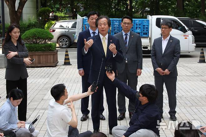 [서울=뉴시스] 김금보 기자 = 정기석 국민건강보험공단 이사장이 22일 오후 서울 서초구 서울고등법원에서 열린 담배회사 상대 약 533억원 규모 손해배상청구소송 항소심 최종 변론 출석에 앞서 취재진 질문에 답하고 있다. 2025.05.22. kgb@newsis.com