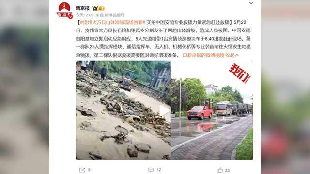 중국 관영 신화통신과 중국중앙TV(CCTV) 등에 따르면 구이저우성 다팡현 창스진에서 2명이 매몰됐고, 다팡현 궈와향에서 8가구 19명이 매몰돼 모두 21명이 매몰된 상태입니다.