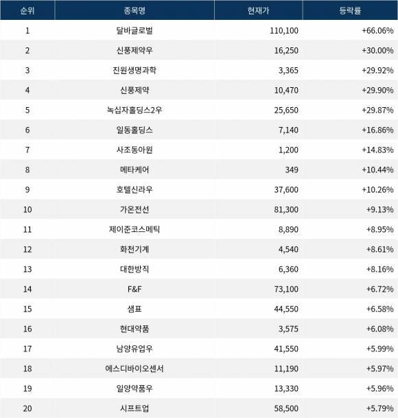 6위 일동홀딩스(000230)는 종가 7,140원으로 16.86% 급등 마감했다. 7위 사조동아원(008040)은 종가 1,200원으로 14.83% 급등 마감했다. 8위 메타케어(118000)는 종가 349원으로 10.44% 상승 마감했다. 9위 호텔신라우(008775)는 종가 37,600원으로 10.26% 상승 마감했다. 10위 가온전선(000500)은 종가 81,300원으로 9.13% 상승 마감했다.