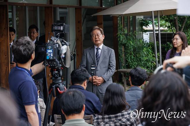 | ▲ 더불어민주당 이재명 대선 후보가 22일 오후 경남 양산시 소소서원에서 송기인 신부와 차담을 마치고 백브리핑을 하고 있다. |