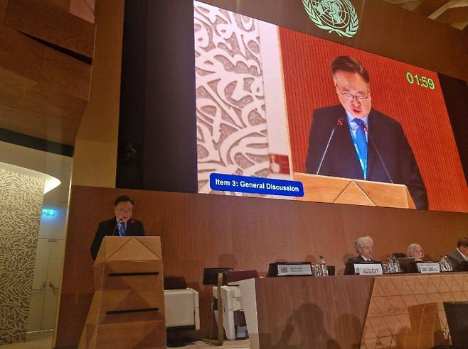 이후 각 회원국 수석대표의 기조연설에서 조 장관은 우리 정부를 대표해 팬데믹 협약 문안 완성을 위해 각국이 보여준 관용과 유연성에 감사를 전했다. 또 오는 9월 개최 예정인 아시아태평양경제협력체(APEC) 보건과경제고위급회의, 백신·치료제 생산 역량 강화를 위한 바이오 인력양성 허브 등 대한민국의 국제사회 참여 사례를 소개했다. 국제적 보건 위기와 WHO의 재정 위기와 같은 현재의 어려운 상황을 개혁의 기회로 전환하고, '건강을 위한 하나된 세상'을 만들기 위한 회원국들의 동참도 요청했다.