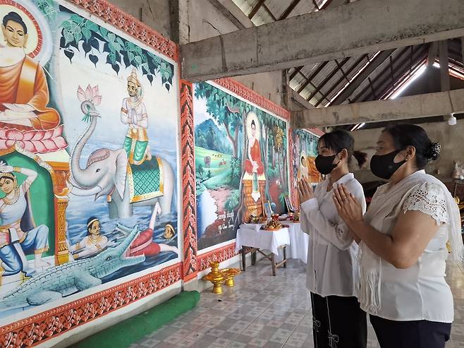 | ▲ 프놈펜 불교사찰을 방문한 캄보디아 현지인들이 마스크를 쓴 채 기도를 하고 있다. |