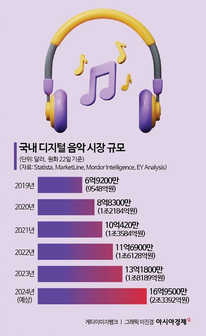 글로벌 음악 시장 역시 2019년 188억달러(약 25조8556억원)에서 2023년 286억달러(약 39조3335억원)로 성장세를 이어가고 있다.