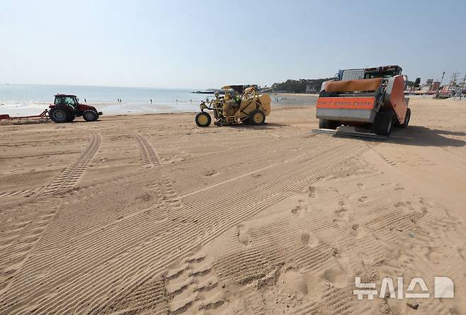 [인천=뉴시스] 전진환 기자 = 22일 오후 인천 중구 을왕리해수욕장에서 중구청 관계자들이 여름철 관광객 맞이를 위해 중장비를 사용해 모래사장 평탄화 작업을 하고 있다.