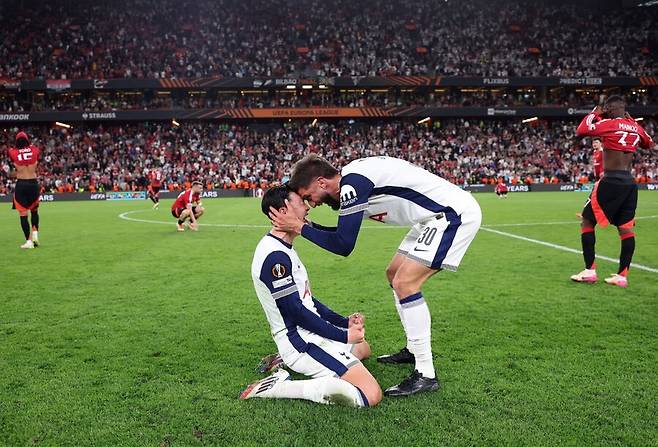 결승 종료 휘슬이 울린 뒤 손흥민은 그대로 주저 앉았다. 그리고 격하게 포효했다. 이후 태극기를 몸에 감고 스페인 빌바오까지 날아온 토트넘 팬들에게 감사인사를 건넸다. 6년 전 챔피언스리그 결승서 합을 맞춘 '옛 동료' 크리스티안 에릭센과도 포옹을 나누며 우승 기쁨을 만끽했다.