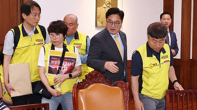 ▲ 우원식 국회의장(왼쪽 네 번째)이 22일 국회에서 MBK사태와 관련한 홈플러스노조원들을 만나 자리를 안내하고 있다.