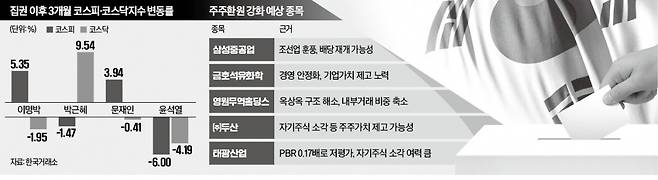 지주회사와 저PBR주에 대한 관심도 높다. 엄수진 한화투자증권 연구원은 “이 후보가 공약한 상법 개정안이 통과되면 주주에 대한 이사의 충실의무 이행을 위해 지배구조 이슈 완화·해소에 더욱 노력해야 할 것”이라며 “지배구조 관련 논란이 많은 기업을 눈여겨봐야 한다”고 했다. 이 후보는 지난달 증권사 간담회에서 “PBR이 0.1배, 0.2배인 회사들이 있는데 빨리 사서 청산해야 하는 것 아니냐”고 발언했다.