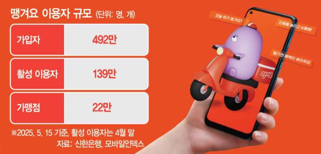 신한은행이 그룹 차원에서 땡겨요에 주력하고 있는 것은 이를 통해 비은행 고객을 유치할 수 있기 때문이다. 땡겨요 이용 고객의 30%는 신한은행 거래가 전무한 이들이고 20%가량은 거래가 드물었던 이들이라는 후문이다. 절반가량이 은행과 계열사 이용객으로 전환할 가능성이 있는 셈이다. 땡겨요의 경우 서울배달플러스와 신한은행 ‘쏠뱅크’, 신한카드 ‘쏠페이’ 앱 등에서 구동이 가능하다. 모바일인덱스에 따르면 지난달 말 기준 땡겨요의 월간활성이용자수(MAU)는 139만 명이다. 전체 땡겨요 회원 수는 약 492만 명, 가맹점은 약 22만 곳이다.