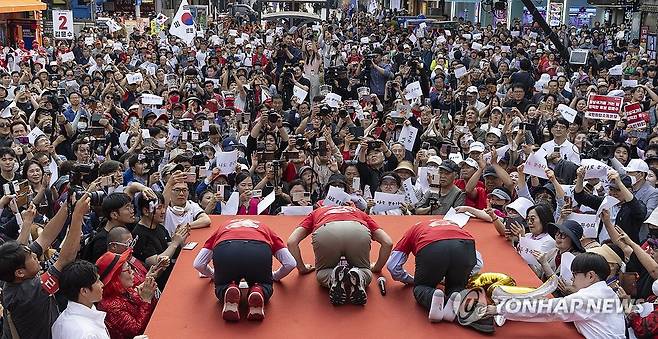 (광명=연합뉴스) 황광모 기자 = 국민의힘 김문수 대선 후보가 22일 경기도 광명시 철산로데오거리에서 열린 유세에서 시민들을 향해 큰 절하고 있다. 2025.5.22