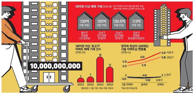 서울 아파트 시장의 '초양극화' 현상이 갈수록 심화되고 있다. 강남·서초·용산구에서는 100억원이 넘는 초고가 아파트 거래가 올 들어 벌써 14건이나 체결됐다. 토지거래허가구역 확대 지정, 스트레스 총부채원리금상환비율(DSR) 규제 강화, 탄핵·대선 국면에도 신고가가 나오며 집값 상승폭이 커지고 있다. 반면 노도강(노원·도봉·강북구) 등 외곽 지역 아파트값은 확연한 보합·하락세를 보인다.