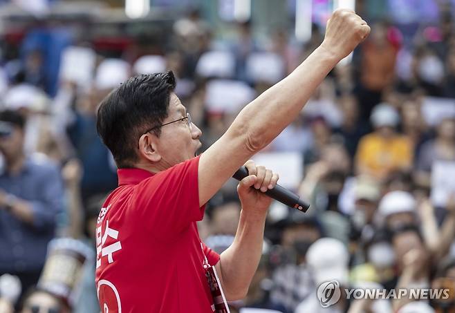 (광명=연합뉴스) 황광모 기자 = 국민의힘 김문수 대선 후보가 22일 경기도 광명시 철산로데오거리에서 열린 유세에서 "할 수 있다" 구호를 외치고 있다. 2025.5.22