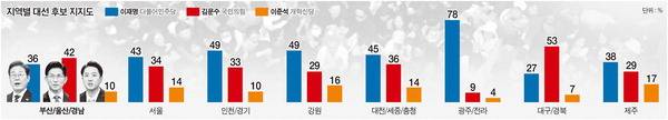 이 후보는 나머지 지역에서 모두 앞섰는데, 특히 광주 전라에서 78%라는 압도적인 지지율을 얻었다. 이곳에서 김 후보는 9%, 이준석 후보는 4%에 그쳤다. 이어 이 후보의 지지율이 높은 곳은 강원, 인천 경기로 각각 49%로 나타났다. 김 후보는 두 곳에서 각각 29%, 33%를 기록했다. 대전 세종 충청은 이 후보 45%, 김 후보 36%이며, 서울은 각각 이 후보 43%, 김 후보 34%이다. 이준석 후보 지지율이 가장 높은 곳은 17%로 집계된 제주였다. 이어 ▷강원 16% ▷서울·대전 세종 충청 14% ▷PK·인천 경기 10% ▷TK 7% ▷ 광주 전라 4%다.
