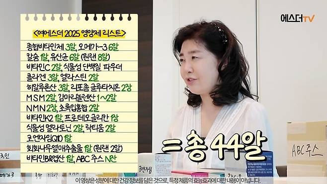 그는 “종합 비타민제 3알, 오메가-3 6알, 칼슘 1알, 유산균 6알(기존 8알), 비타민C 2알, 식물성 단백질 파우더, 콜라겐 3알, 엘라스틴 2알, 히알루론산 3알, 리포좀글루타치온 2장” 등 총 44알의 영양제를 소개했다.