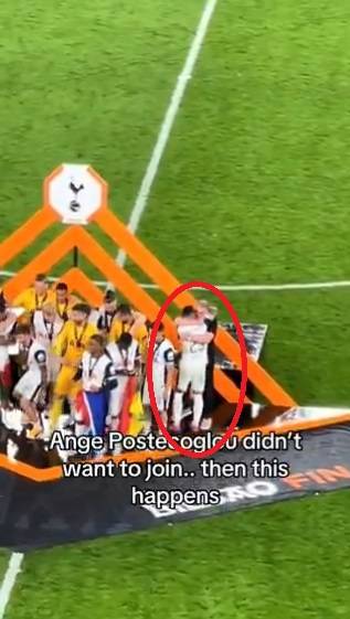 이날 우승식에서 안지 포스테코글루 토트넘 감독을 감싸안은 스퍼스 선수단이 화제다.