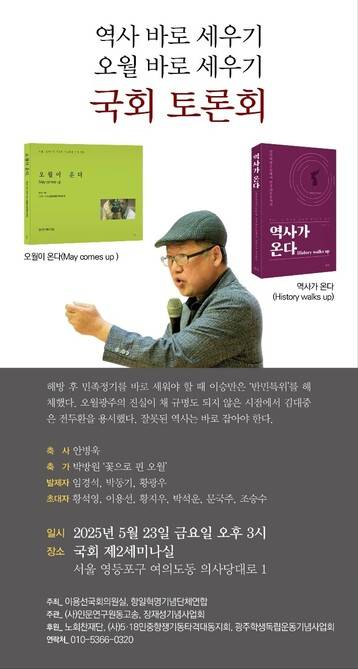 황 작가는 23일 오후 3시 국회제2세미나실에서 항일혁명기념단체연합 주최로 열리는 토론회에서 ‘역사 바로 세우기 오월 바로 세우기’에 관해 이야기한다. 토론회에 황석영 작가와 황지우 시인, 안병욱 전 한국학중앙연구원 원장, 이용선 국회의원 등이 참석한다.