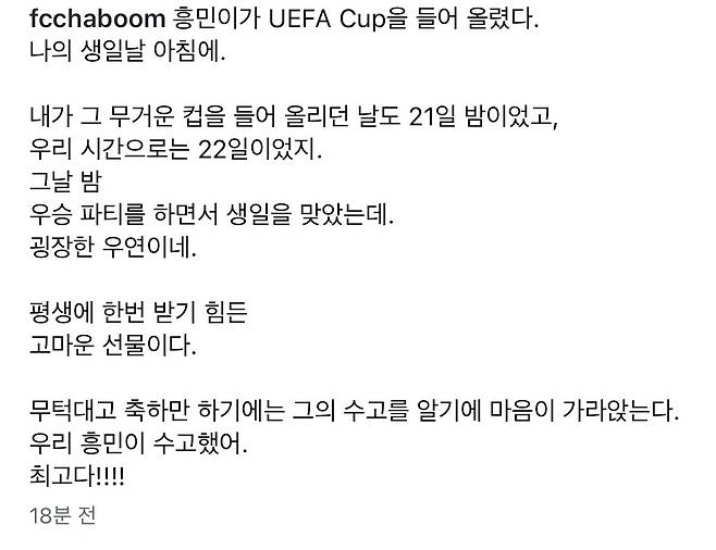 차 전 감독은 생일날 UEFA컵 우승컵을 들었는데, 손흥민도 운명처럼 차 전 감독 생일에 우승컵을 들어 올렸다.