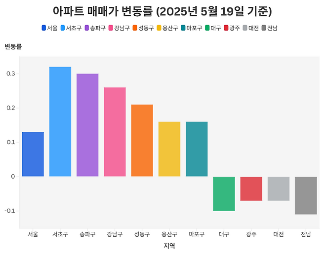 서울 상승세는 강남 3구와 ‘마용성(마포·용산·성동)’이 주도했다. 서초구는 0.32%, 송파구는 0.30%, 강남구는 0.26% 올라 각각 서울 25개 자치구 중 최상위권에 올랐다. 이 외에도 성동구(0.21%), 용산구(0.16%), 마포구(0.16%) 등 인기 지역이 줄줄이 오름세를 나타냈다.