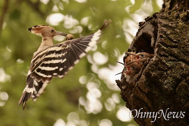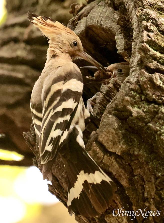 천년의 함양 상림숲 고목 속에 둥지를 틀고 새끼를 키운 '후투티' 가족이 카메라에 잡혔다.