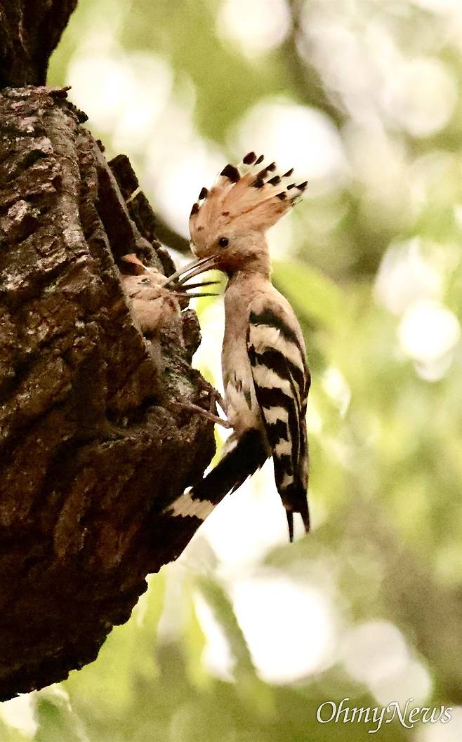 천년의 함양 상림숲 고목 속에 둥지를 틀고 새끼를 키운 '후투티' 가족이 카메라에 잡혔다. 22일 오후 후투티 어미가 먹을거리를 물어다가 새끼한테 먹이는 장면이 포착되기도 했다.
